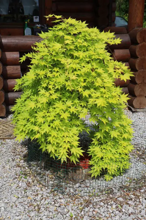 Acer palmatum 'Cascade Gold' est un arbuste compacte en colonnes avec des branches pendantes et des feuilles profondément incisées. Les jeunes feuilles sont jaune doré avec des bords orange-rouge, puis plus tard en été, d’un vert vif à orange/rouge en automne.
