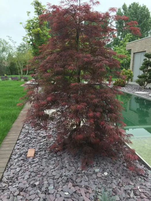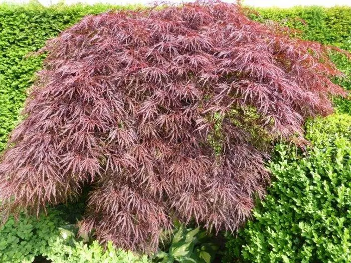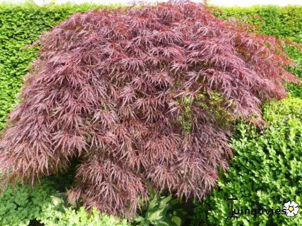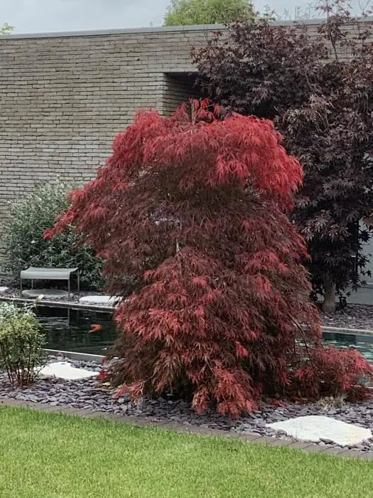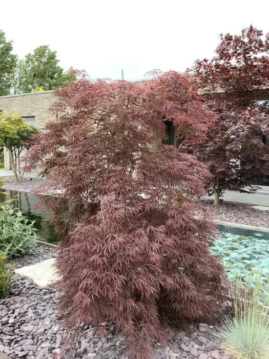 Acer palmatum var. Dissectum 'Inaba-shidare' présente un habit gracieux, s’étendant légèrement et s’inclinant, ainsi que des feuilles très fines, profondément incisées et en forme de dentelle, qui prennent différentes nuances de rouge selon la saison.