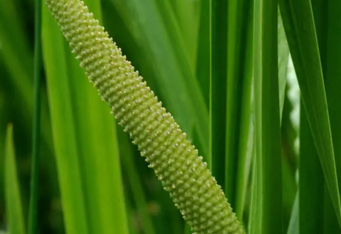 Les fleurs sont nombreuses et rapprochées en spadix, qui semblent émerger latéralement d’une feuille car la bractée est juste alignée avec la tige florale. Les fleurs verdâtres-jaunâtres, d’environ 7 cm, sont couvertes d’innombrables petites fleurs insignifiantes. Chez le calamus, contrairement aux autres membres de la famille des arum, la bractée est absente. La bractée est officiellement appelée spatha, le spadix est alors spadix. La floraison a lieu en juillet et août, mais est souvent même ignorée. En général, une seule période de floraison peut être observée par saison d’étang. Le calamus n’est pas non plus cultivé pour les fleurs, mais pour les feuilles et leur influence positive sur la qualité de l’eau.