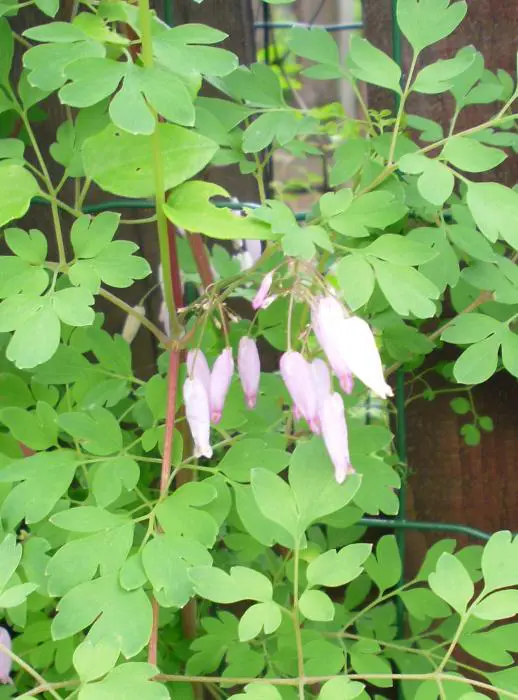 Adlumia fungosa est une grimpatrice à croissance rapide avec un feuillage vert semblable à une fougère et des fleurs tubulaires de rose doux.