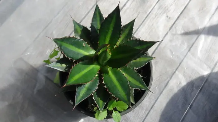 Agave univittata 'Splendida' provient du sud du Texas et forme une rosette de feuilles vertes épaisses avec une large bande verdâtre jaune au centre de la feuille, des dents blanches et acérées sur les bords et de courtes épines à l’extrémité.