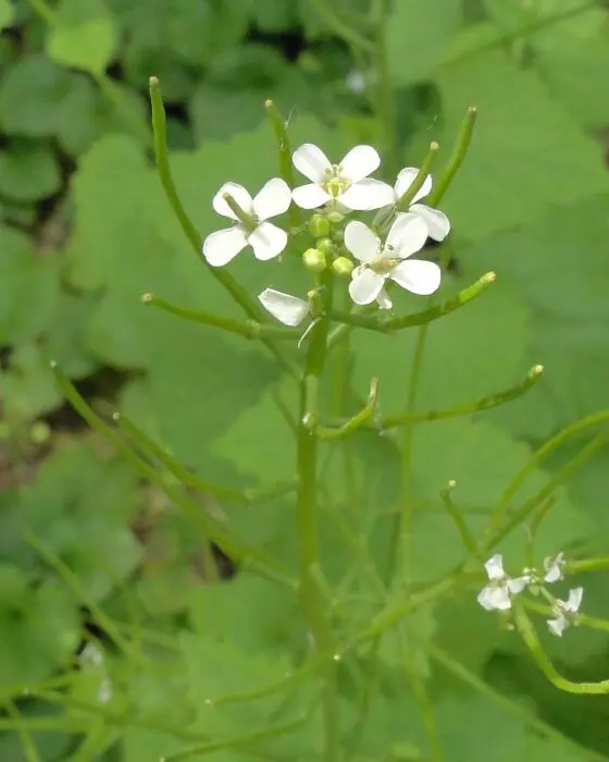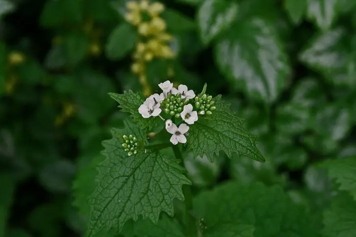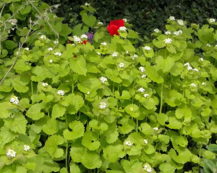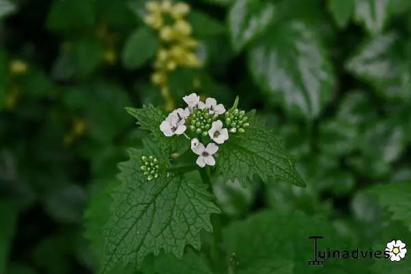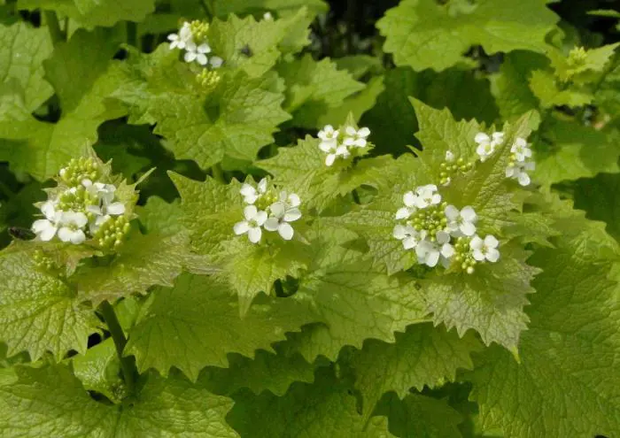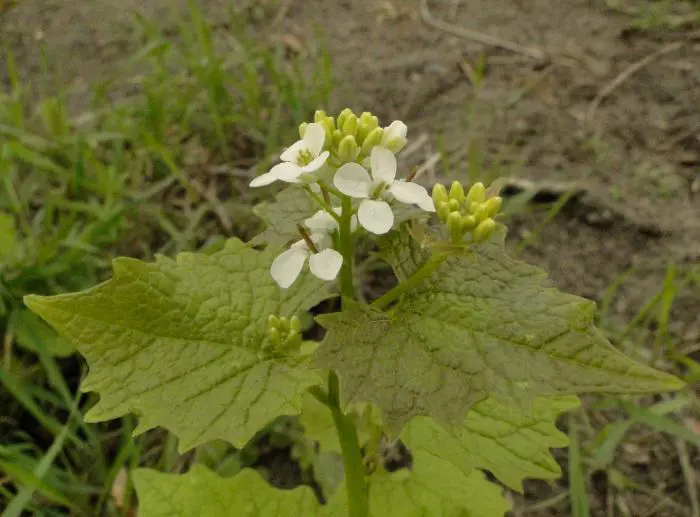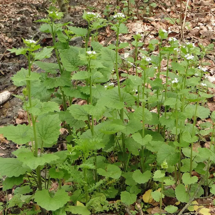 Alliaria petiolata pousse principalement le long des routes, des routes, des ruisseaux et des forêts. A des feuilles fraîches, vertes, grandes en forme de cœur, qui sentent fortement l’ail après le frottage.
