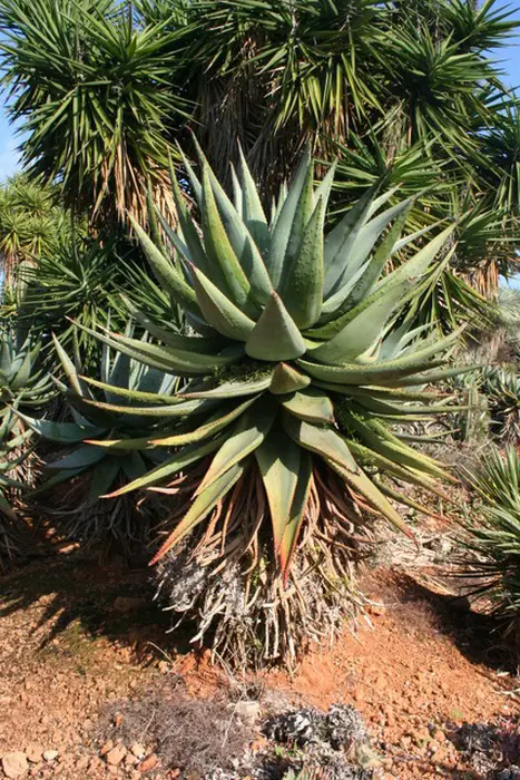 Elle forme un tronc court avec de grandes feuilles longues, épineuses et succulentes.