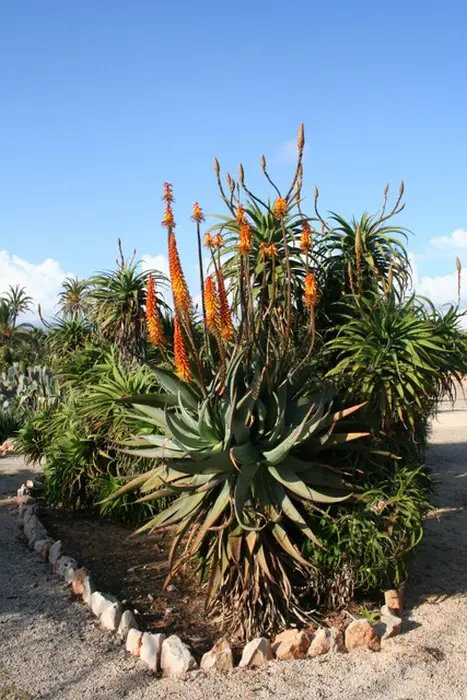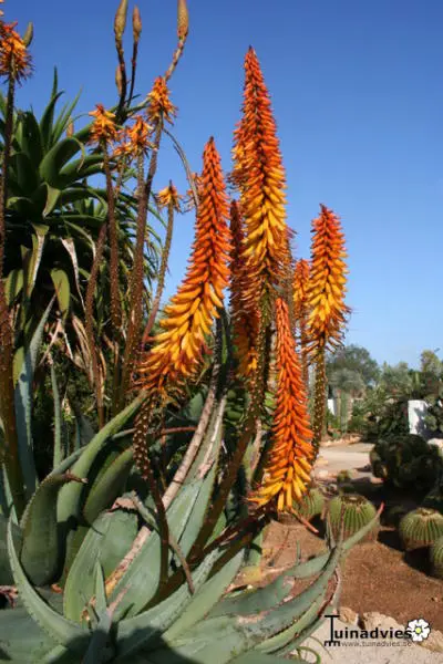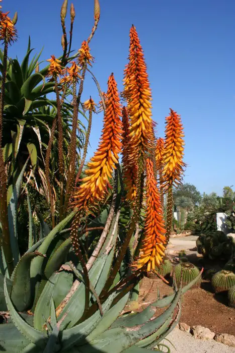Des grappes de fleurs orange-rouge frappantes poussent comme des chandeliers depuis le sommet de la plante.