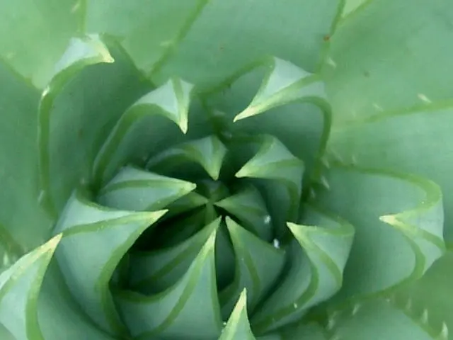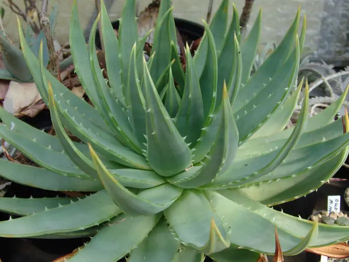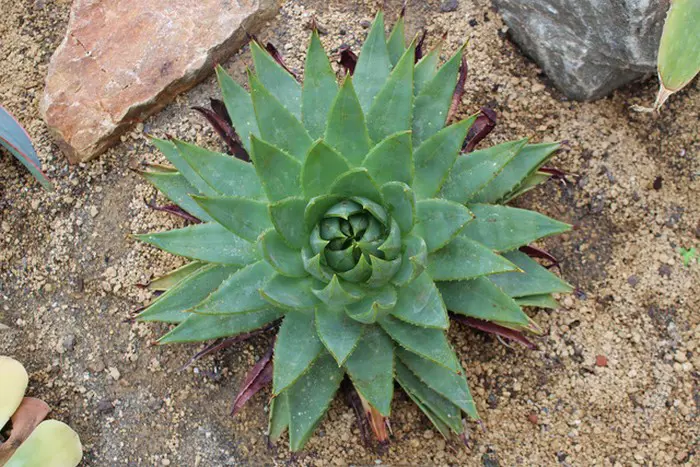 Cinq rangées de feuilles triangulaires sont disposées en spirale. Les feuilles sont gris-vert, dentées et très pointues avec des pointes violettes.