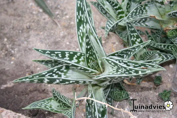 Elle forme une rosette de feuilles raides et charnues, vert foncé avec des rayures blanches.