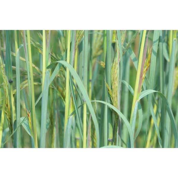 Andropogon gerardii 'Yellow Arrow' est une grande herbe aux feuilles courbes, linéaires, gris-vert, qui deviennent brun-rougeâtre en automne.