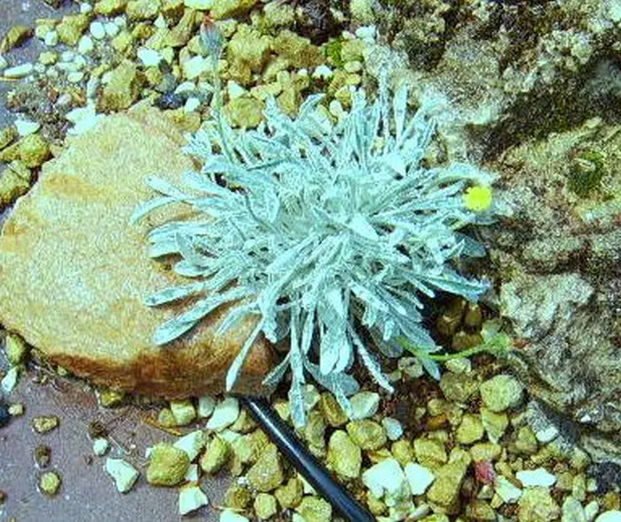 Possède un rhizome ligneux qui peut se ramifier avec le temps en un semi-arbuste avec des feuilles grisées en forme de spatule.