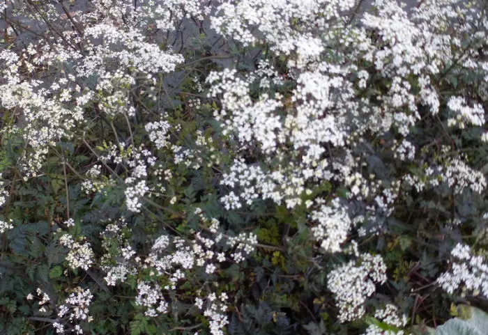 Elle fleurit avec de gracieuses ombres de petites fleurs blanches avec des bractées roses.