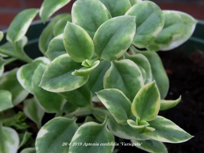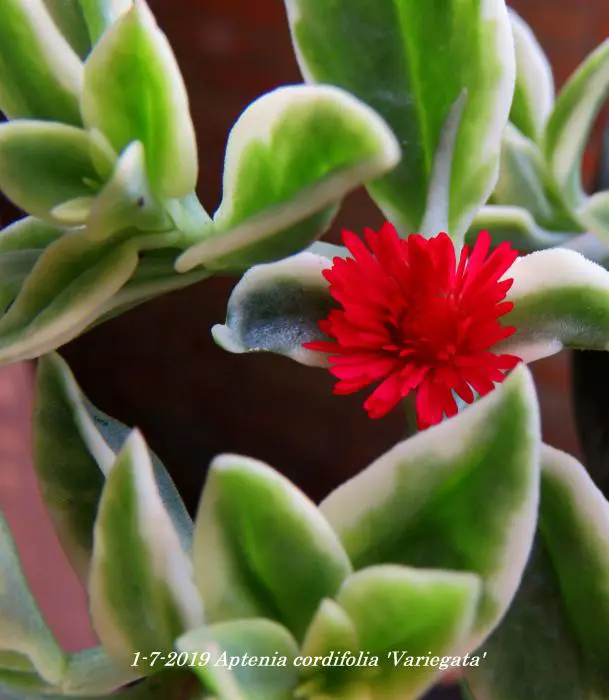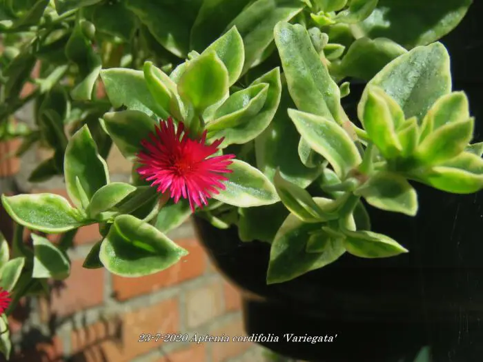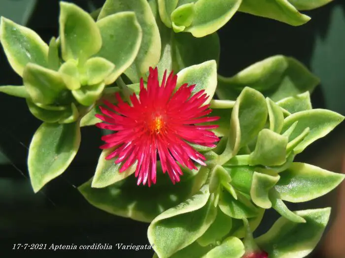 Aptenia cordifolia 'Variegata' est une plante succulente d’Afrique du Sud à l’habit rampant, fleurissant avec des fleurs magentaroze éclatantes. Les fleurs ne s’ouvrent qu’en temps ensoleillé.