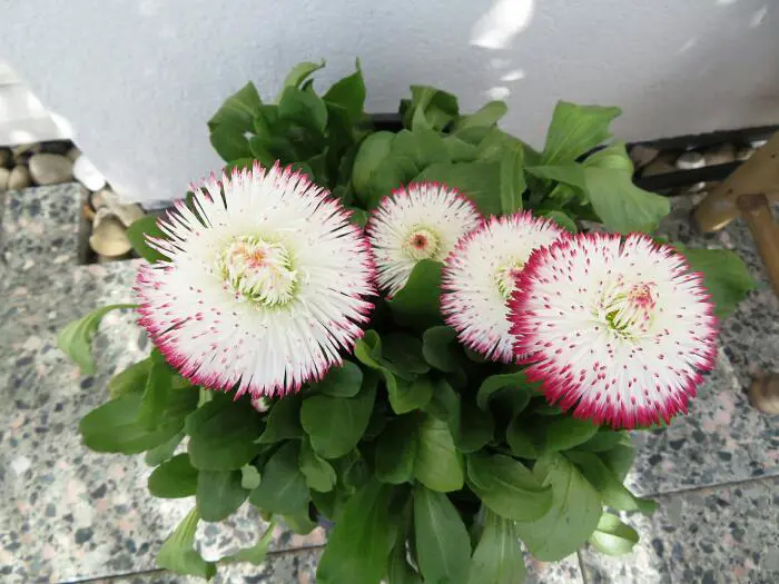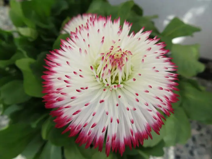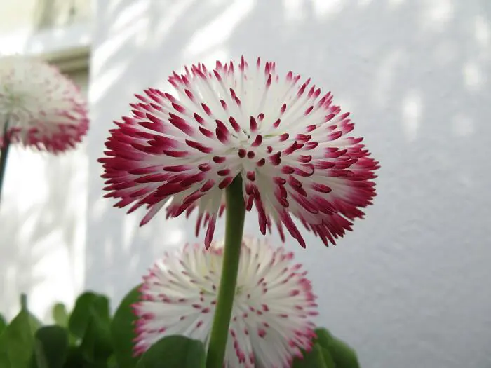 Bellis perennis 'Pomponette' fleurit avec des fleurs bicolores roses et blanches, semblables à des pompons.