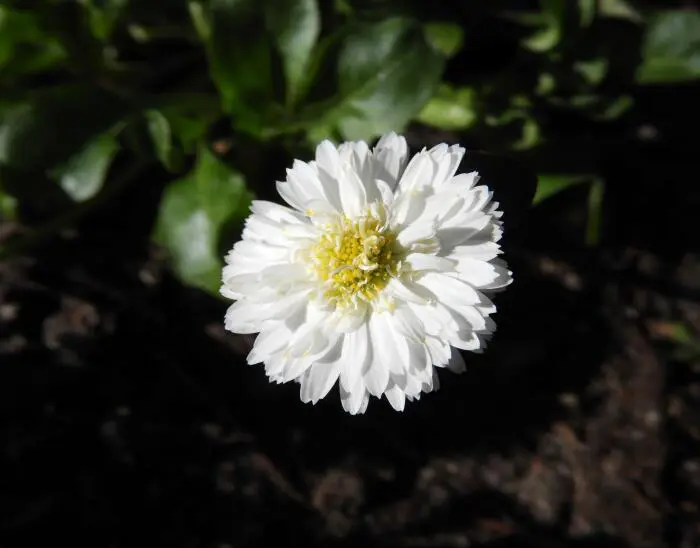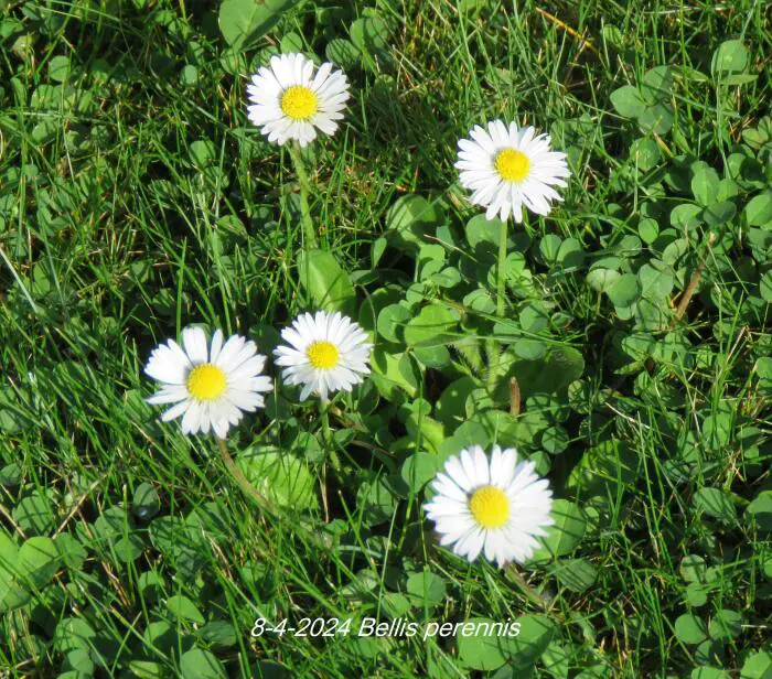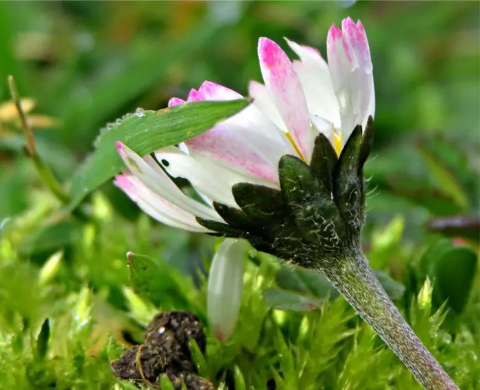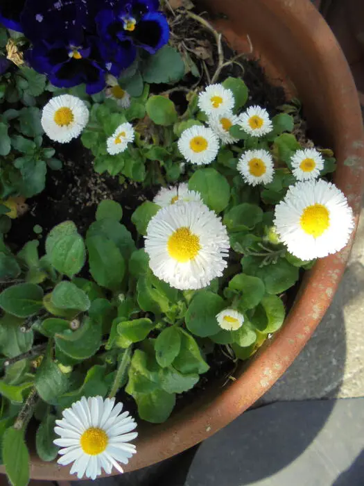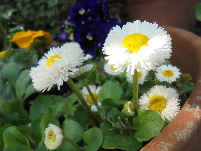 Les bellis perennis sont de petites marguerites à cœur jaune avec des pétales blancs teintés de rose violet sur le dos.