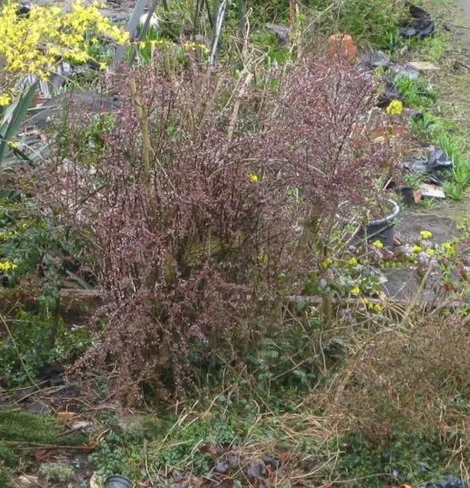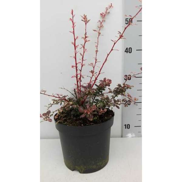 Berberis thunbergii 'Harlequin' est un magnifique arbuste rond épineux avec de petites feuilles rondes rose-rouge brillantes, grises/rayées, qui deviennent magnifiquement violettes-rouges en automne.