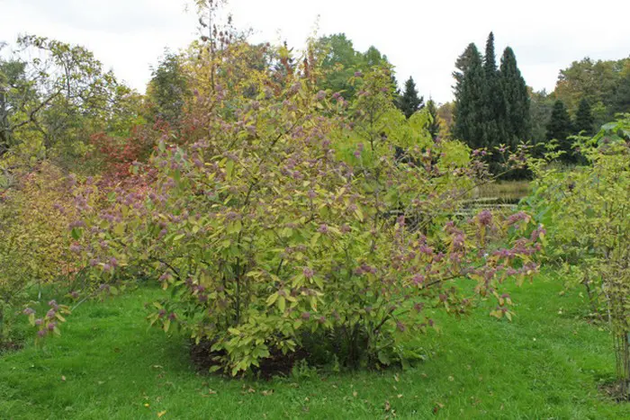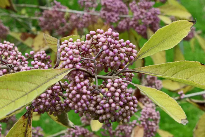 Callicarpa cathayana est un arbuste droit aux feuilles gris-vert ovoïdes à elliptiques, qui deviennent orange, rouges et violettes en automne.