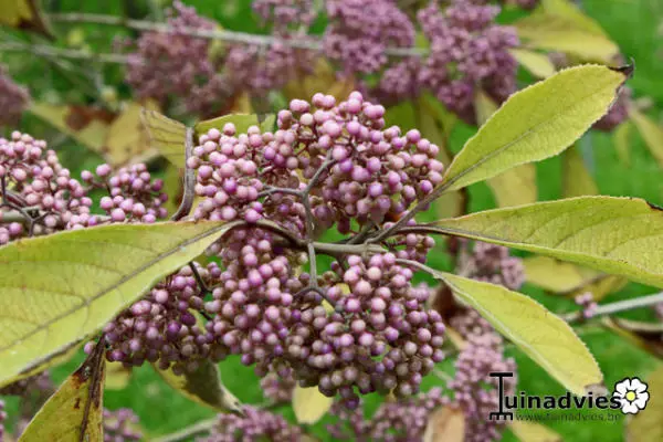 Elle fleurit en été avec de petites fleurs rosé-blanc, suivies de baies violette-rosées en octobre/novembre.