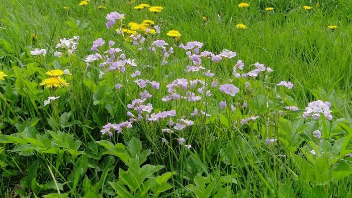 La cardamine pratensis ou fleur de coucou a souvent terminé sa floraison avant la Pentecôte. Fleurs d’avril à juin avec de petites ombelles allant de fleurs blanches à lilas. Quand il pleut, les fleurs se ferment et pendent.