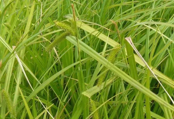 Une herbe verte fraîche avec des spikelets gracieusement suspendus.