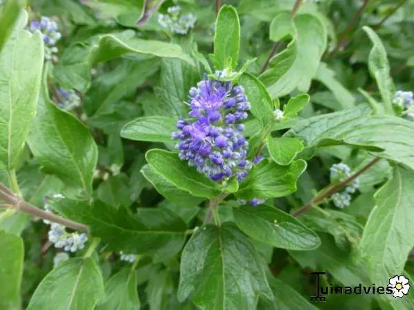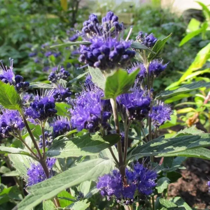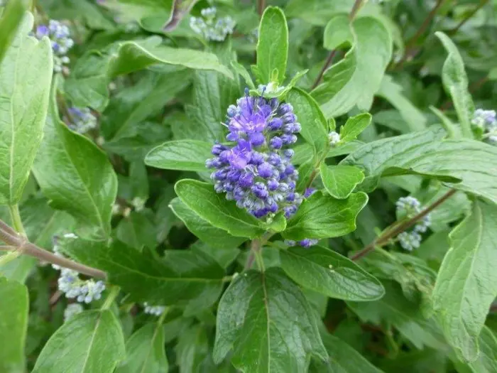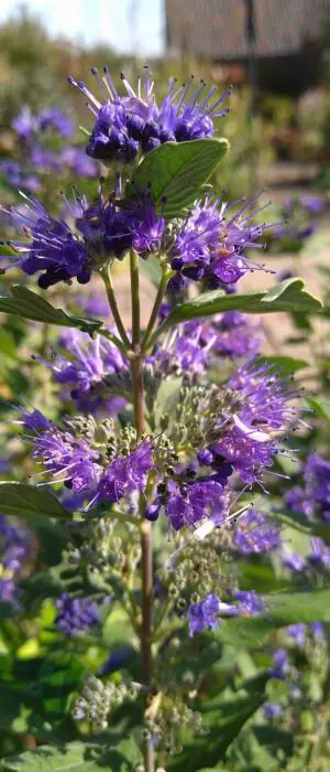 Comparé à ses parents, ce Caryopteris x clandonensis 'Grand Bleu' a des feuilles plus grandes et plus larges, vertes avec argent en dessous. Les feuilles sont aromatiques et sentent la menthe lorsqu’on les touche ou les frottent.