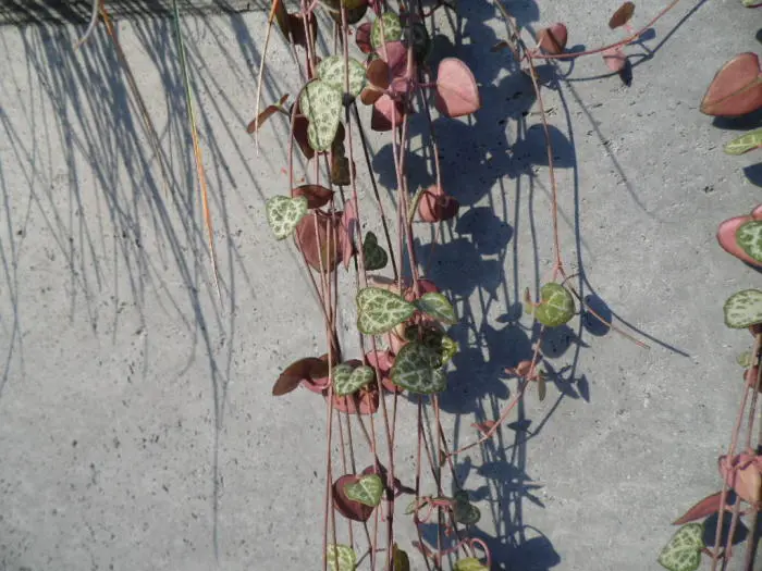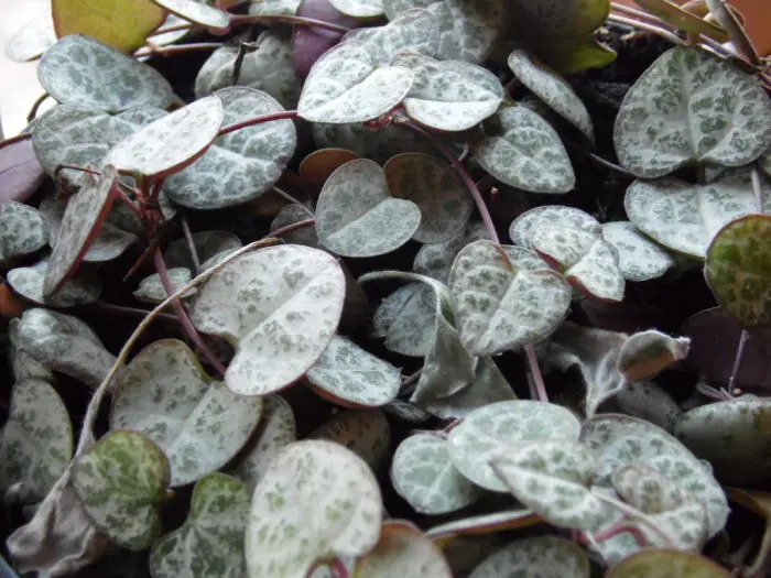 La plante forme de longues tiges très fines de 1 m de long avec de petites feuilles vertes en forme de cœur, marquées d’un gris argenté. Le dessous des feuilles est violet.