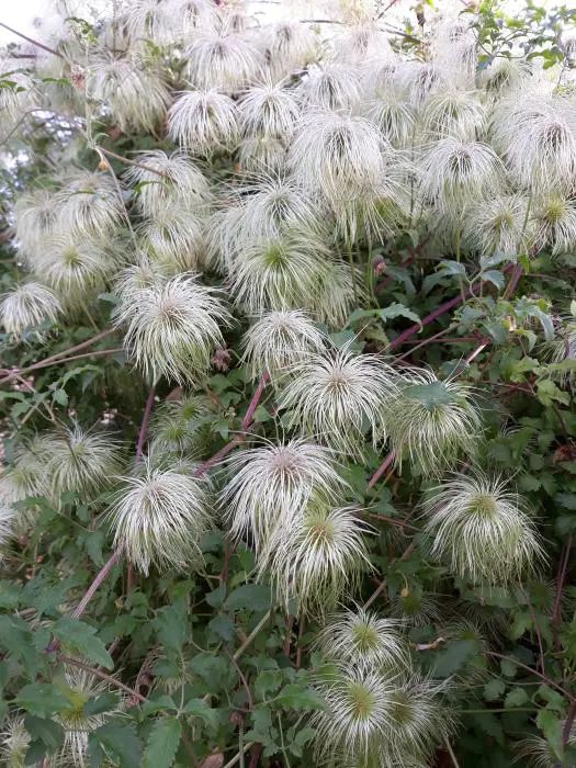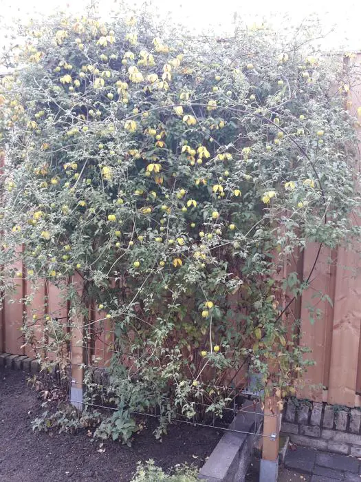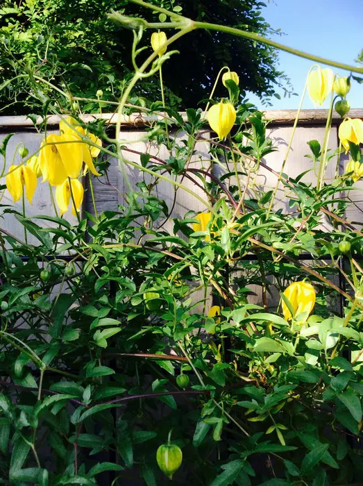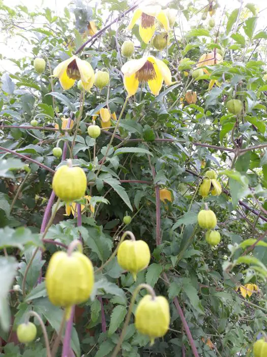 Ce C. tangutica a des fleurs plus grandes et plus longues, jaune vif avec des anthères beiges à vertes suivies de longues têtes de graines.