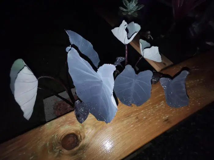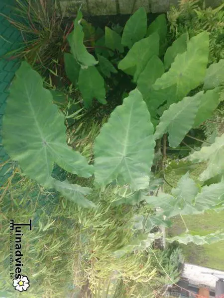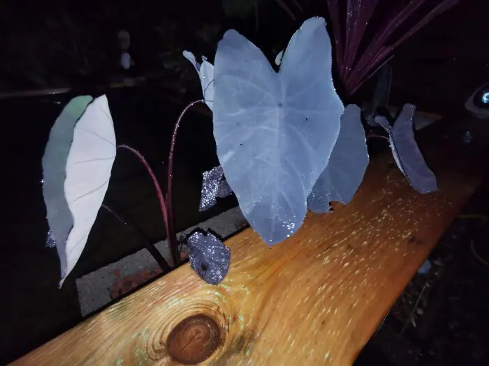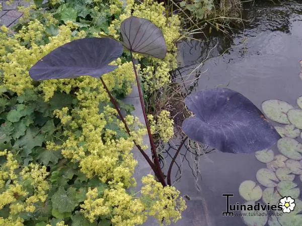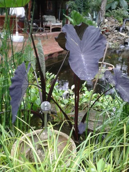 C’est une plante à croissance verticale avec de longues tiges bordeaux violacées sur lesquelles poussent d’abord les feuilles vertes à veines violettes, qui deviennent ensuite violettes, presque noires. Le dos de la feuille est gris crayeux. C’est vraiment beau quand le soleil traverse la feuille et qu’on peut voir les veines sombres. Les feuilles en forme de flèche mesurent 50 cm.