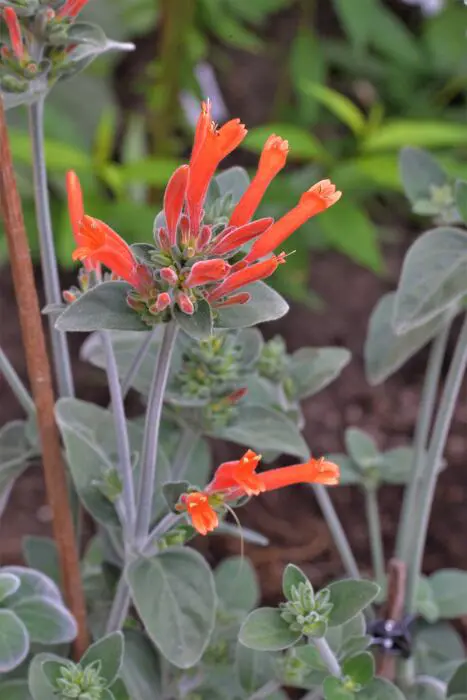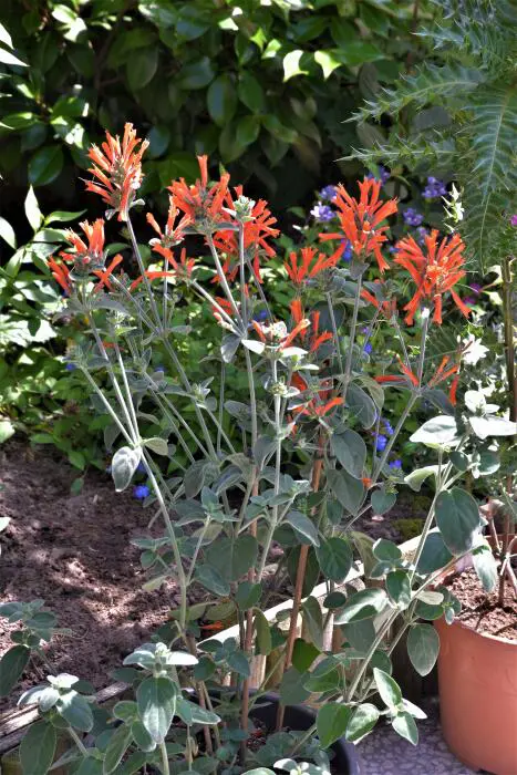 Fleurs avec des grappes dressées de fleurs tubulaires orange-rouge.