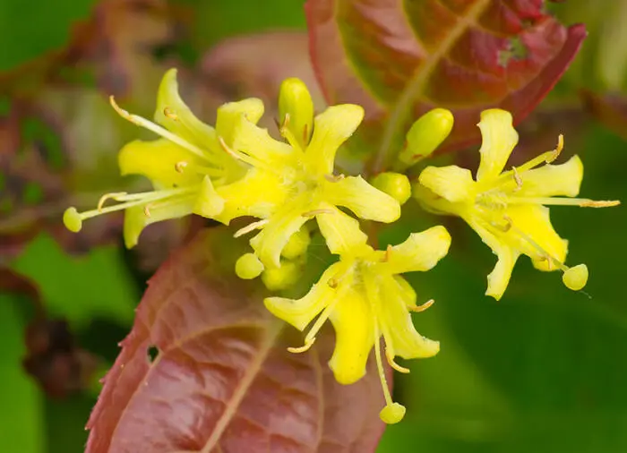 Diervilla x splendens, originaire d’Amérique du Nord, est un arbuste bas avec des fleurs jaune soufre éclatantes à l’extrémité des branches. Les feuilles teintées de vert violet sont ovales lancéolées. Prenez une couleur rouge automne.