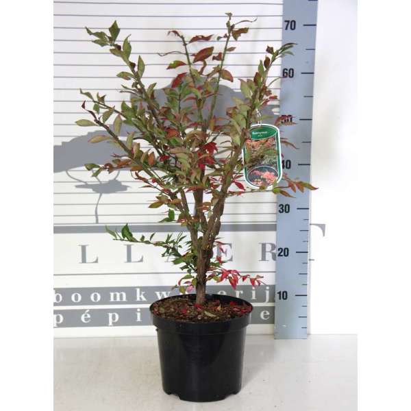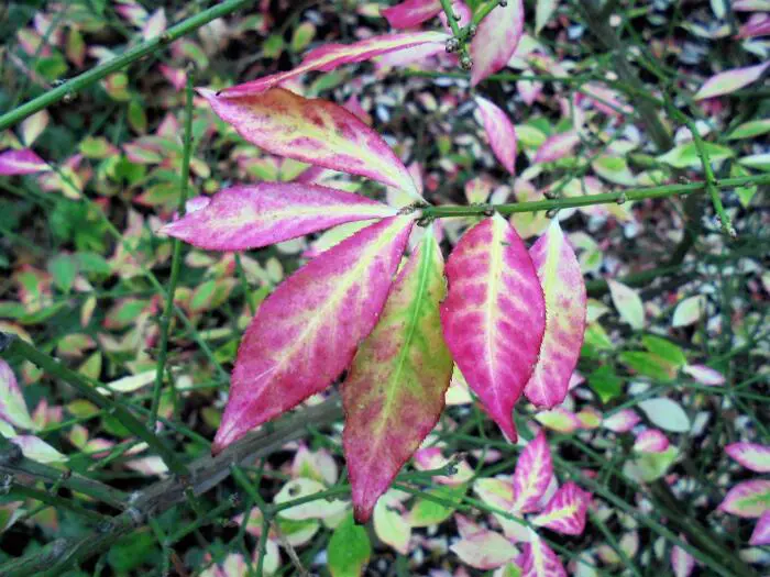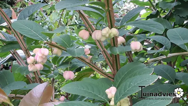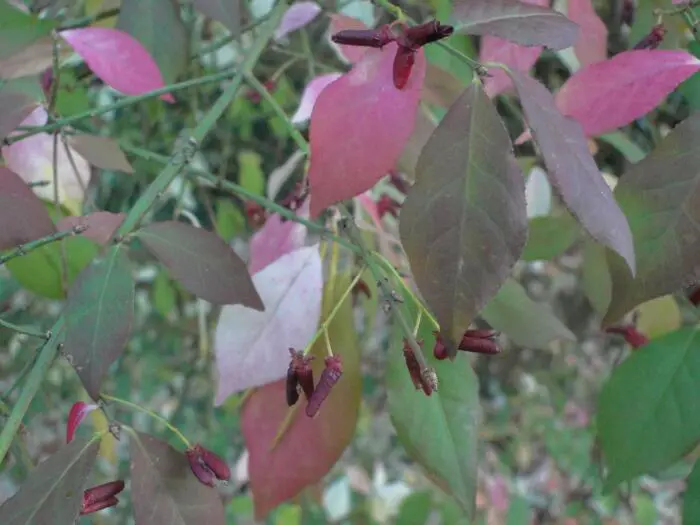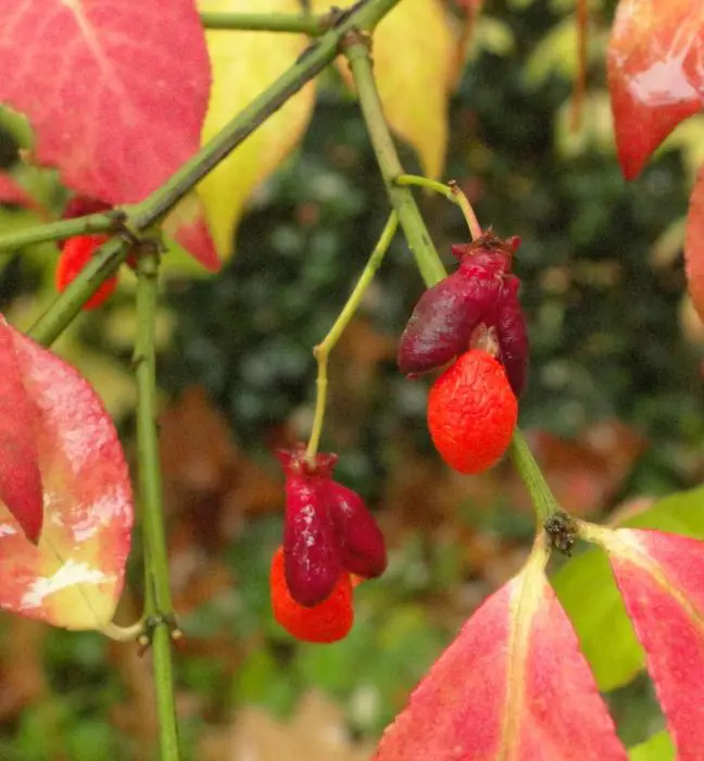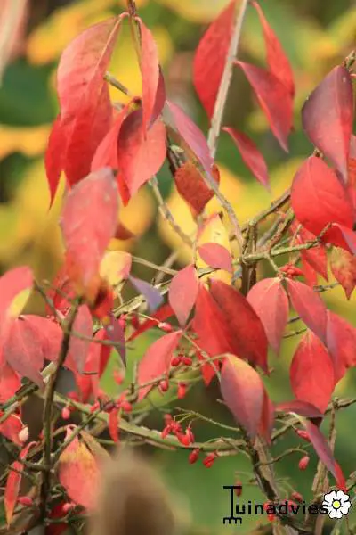La floraison n’est pas visible, mais l’arbre fuseau est particulièrement précieux pour ses magnifiques couleurs d’automne allant du jaune au rouge violet et les fruits roses.