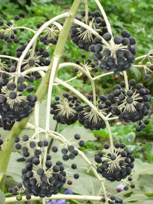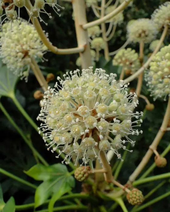 Les plantes plus âgées fleurissent parfois avec des grappes de petits pompons blanc crémeux. suivis de fruits noirs ronds et attrayants.