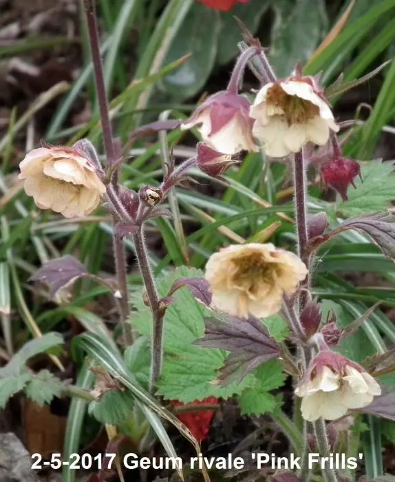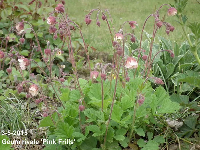 Geum 'Pink Frills' a des pétales frangés roses avec des sépales de couleur violette sur des tiges brun châtaigne.