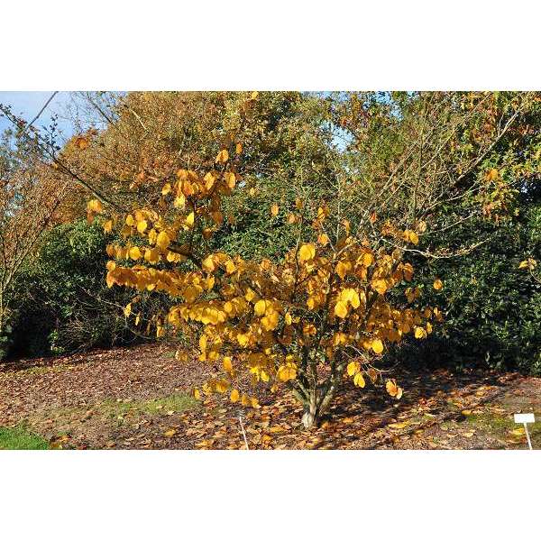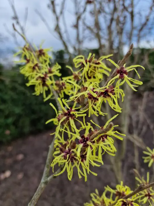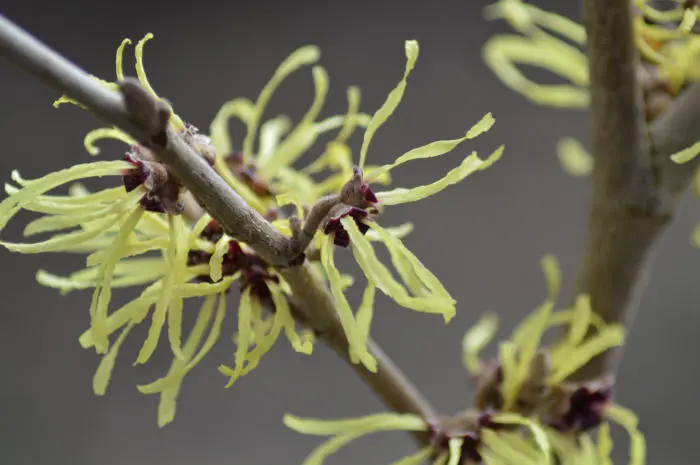 Hamamelis x intermedia 'Pallida' est un arbuste droit avec une fleur très particulière. Éclaire la saison avec des grappes de filaments légèrement parfumés, jaune soufre, sur les branches nues.