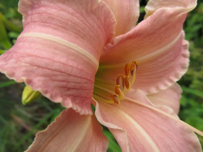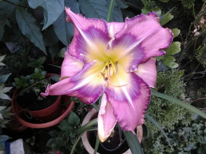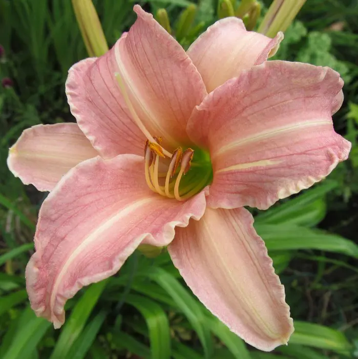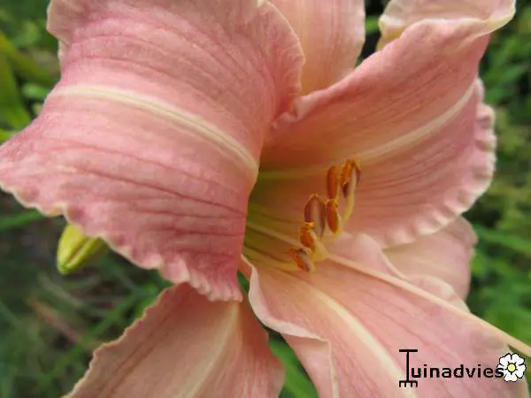 Hemerocallis 'Festival des Enfants' fleurit en rose avec une gorge jaune doré et une large bande blanche sur les pétales.