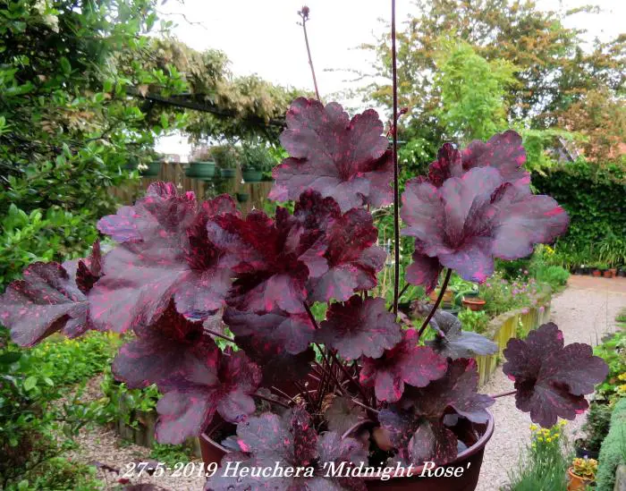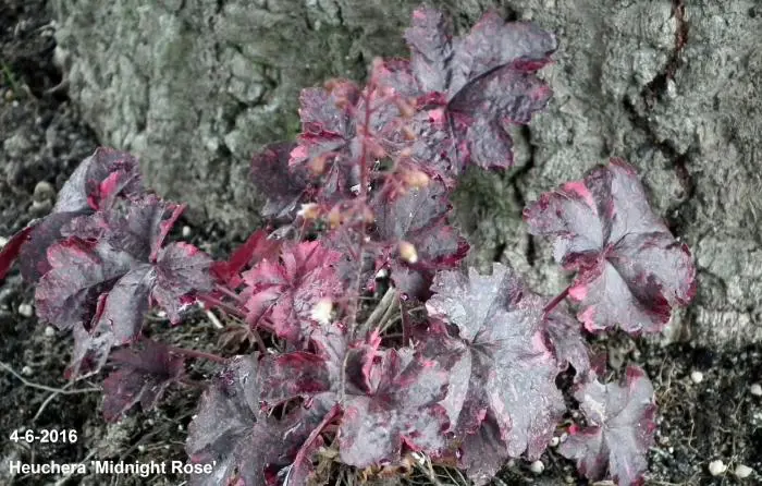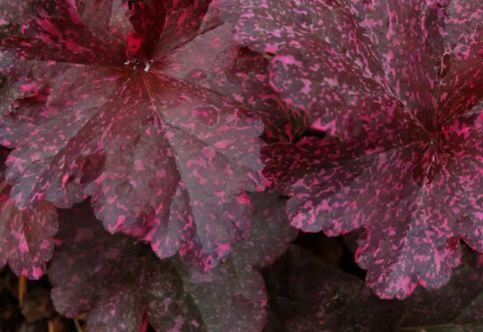 Heuchera 'Midnight Rose' a des feuilles noir-violacées avec des points roses et des fleurs avec de fines ombelles blanches.