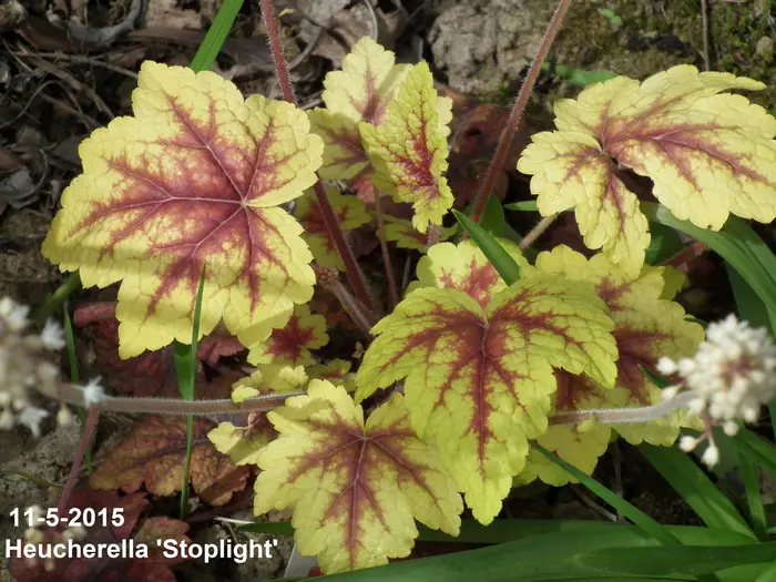 « Stoplight » présente une feuille jaune-vert vif avec des veines rouges frappantes. En été, les feuilles deviennent plus vertes.
