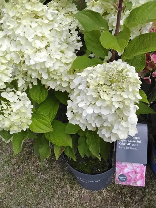 Hydrangea paniculata « LIVING Colourful Cocktail » avec des grappes de fleurs en forme de cône. Au fil de la saison, les fleurs changent de couleur, passant d’un blanc crème à un rose foncé.