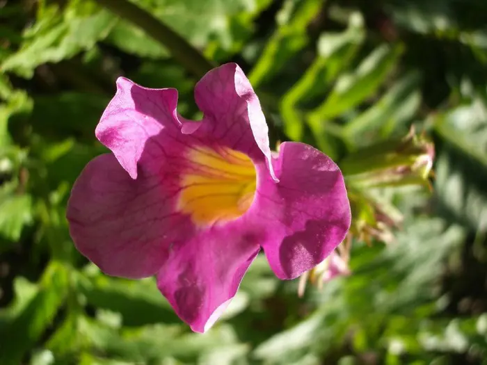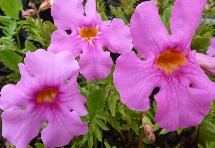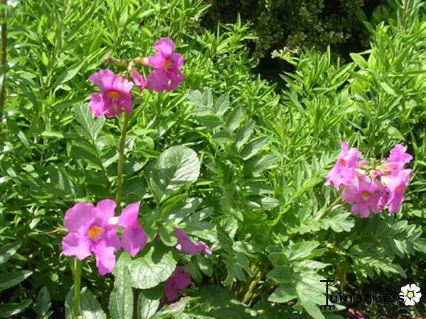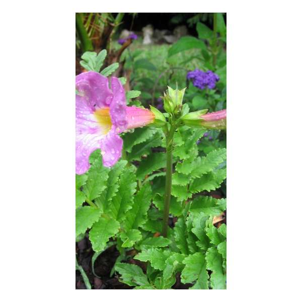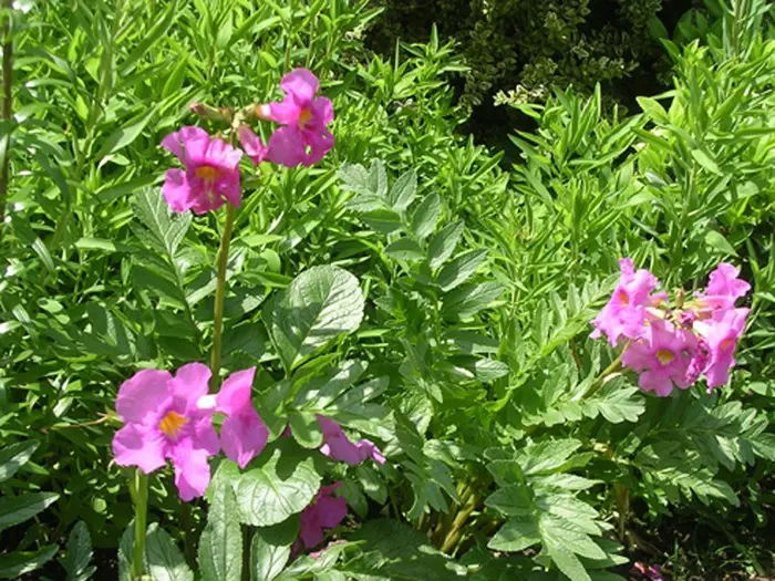 Incarvillea delavayi 'Snowtop' fleurit avec des grappes de fleurs rose-rouge sur une tige robuste.