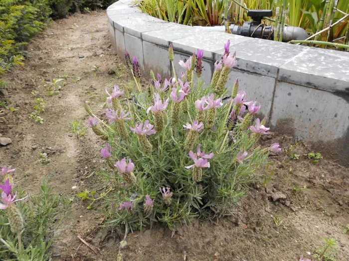 Lavandula Stoechas 'Sancho Panza' fleurit d’un bleu lavande avec une crête rougeâtre.