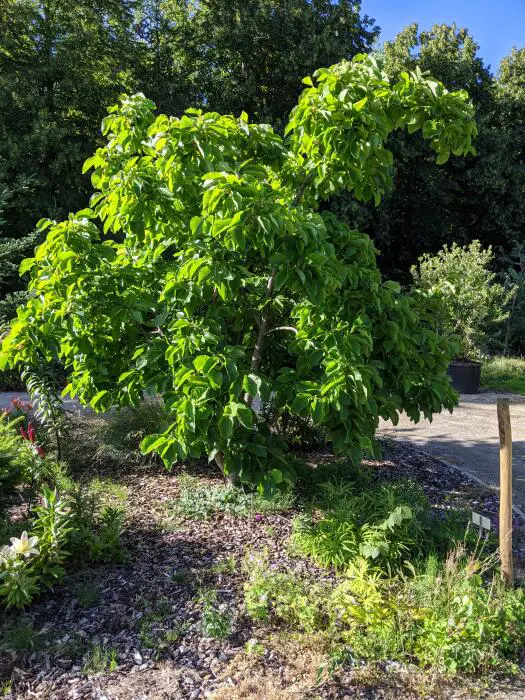 Magnolia 'Elizabeth' forme un petit arbre pyramidal/grand arbuste avec des fleurs jaune crème. Les fleurs apparaissent avant les feuilles.