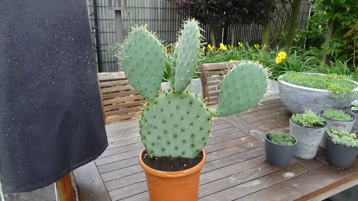 Opuntia engelmannii forme un cactus touffu avec des disques bleu-vert de ø 30 cm et des épines de 2,5 cm de long.