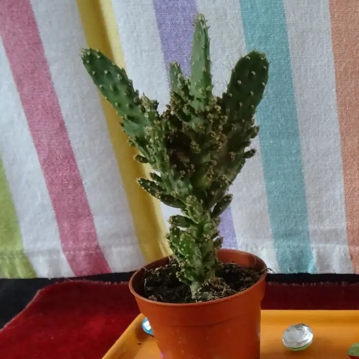 C’est un cactus dressé, irrégulier, avec des segments ramifiés, aplatis, largement ovoïdes, verts avec des épines.