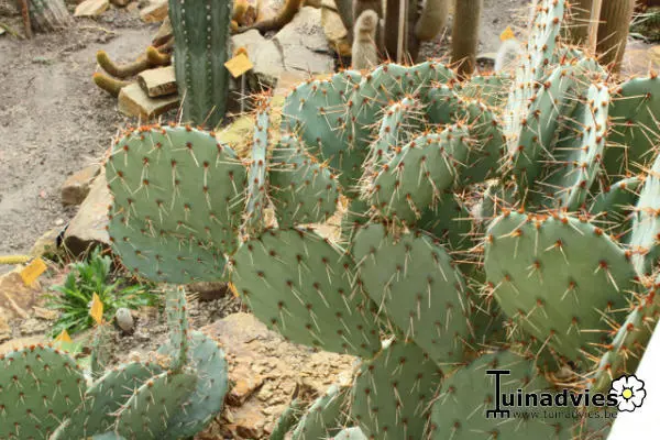 C’est un cactus épineux avec des disques plats ovales bleu-vert (jusqu’à 30 cm) avec de longues épines grises brun-rougeâtres (+3 cm) et de petites épines gris-poilues. Les mandrils sont généralement alignés 2 à 3 ensemble sur la partie supérieure des disques.