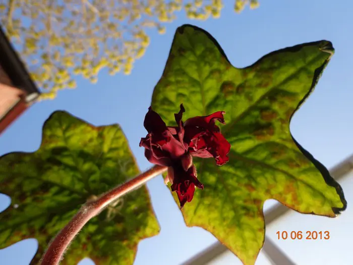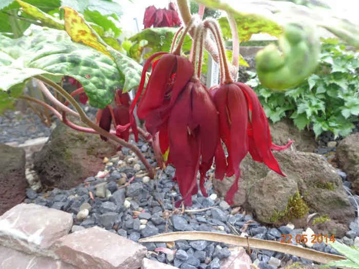 Podophyllum 'Spotty Dotty' a des feuilles marbrées, les fleurs rose-rouge/brun-rouge sentent désagréablement, des fruits comestibles apparaissent après la floraison en septembre/octobre.