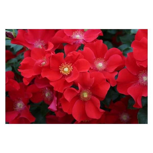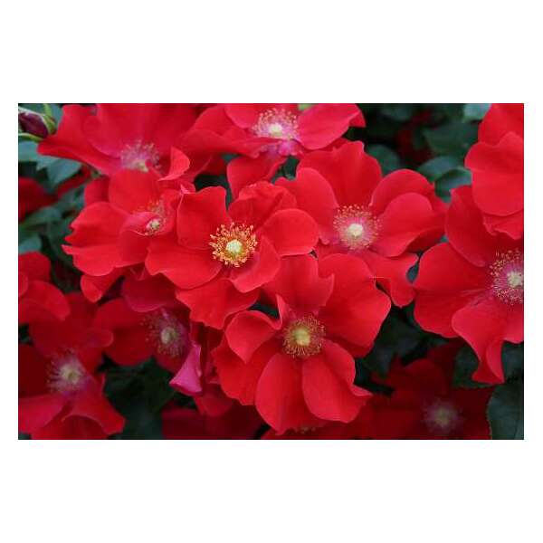 Rosa 'Alexander Von Humboldt' est une rose très saine avec des grappes de fleurs rouges vives (5-6 cm de pouce) et un cœur d’étamines jaune doré.