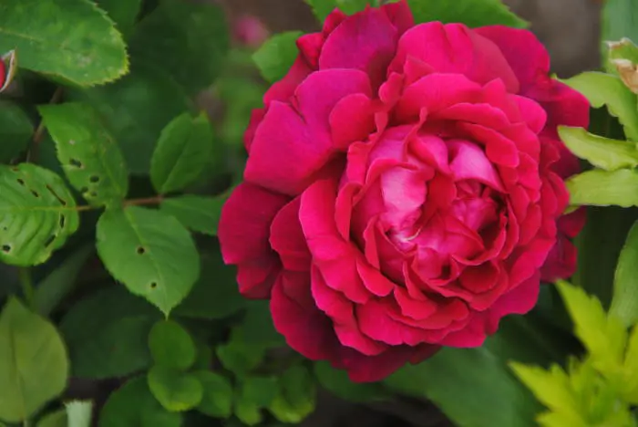 Rosa « Alfred Colomb » est une rose presque sans épines avec de grandes fleurs roses-rouges bien remplies.
