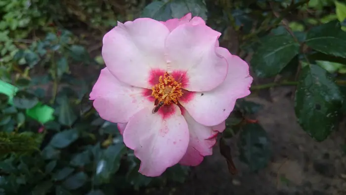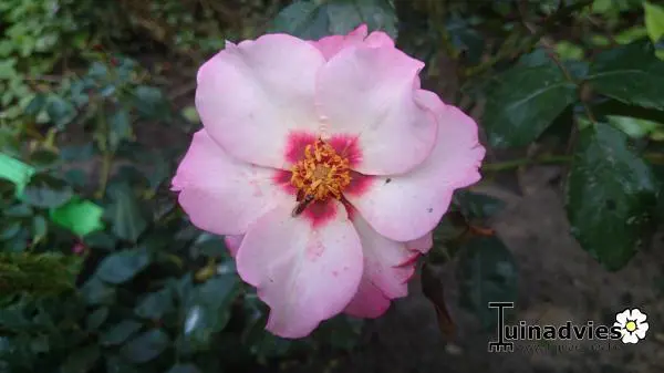 Une rose semi-double, modérément parfumée. La fleur crème a un rose pâle, passant à un rose plus foncé avec un anneau rose profond autour du cœur au centre.