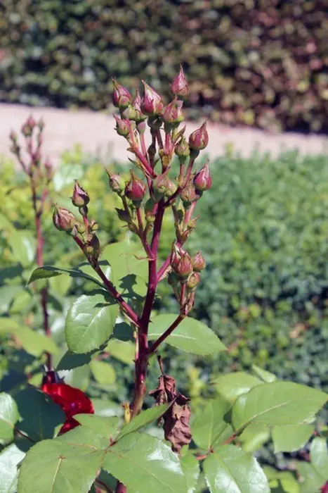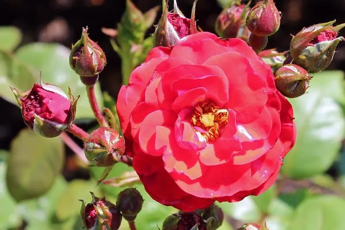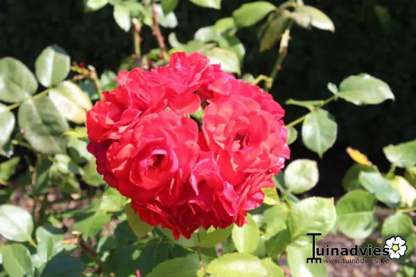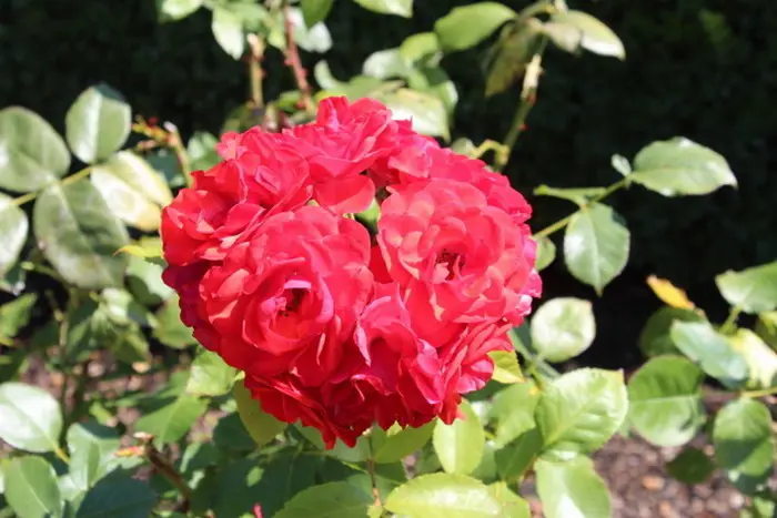 Une rose à fleurs continues avec des fleurs semi-doubles allant de l’orange au rouge-orangé.