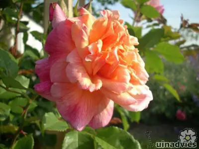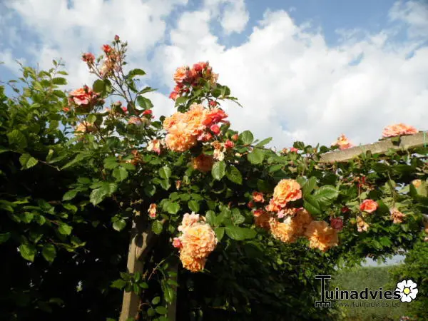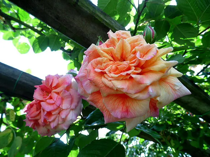 Une rose en pleine fleurs continues avec des abricots, des roses jaune ambré passant du rose au rouge même.
