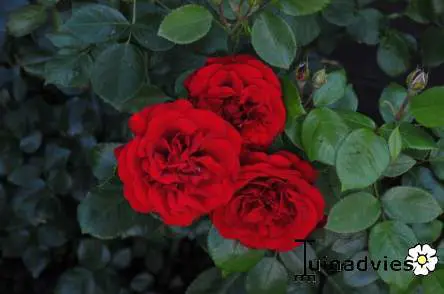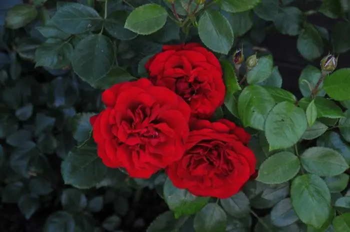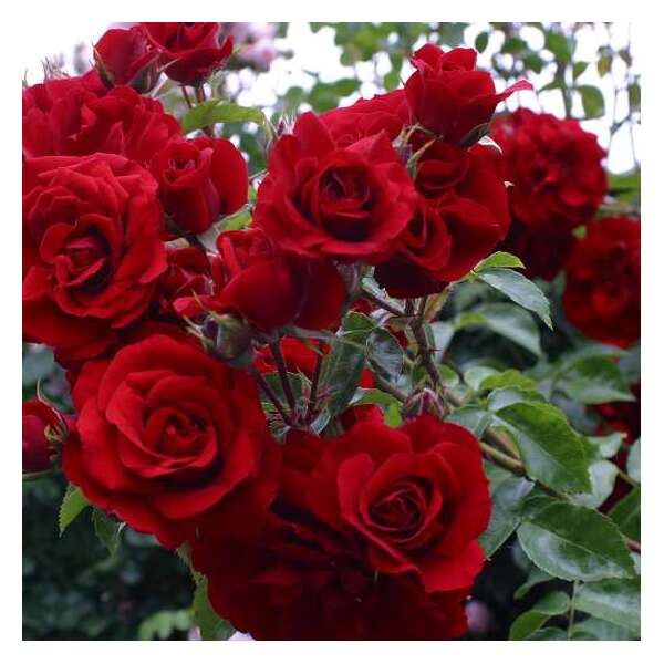 Rosa 'Amadeus' est une rose à fleurs claires, avec des fleurs rouge sang richement doublées.
