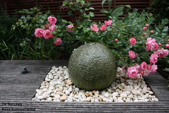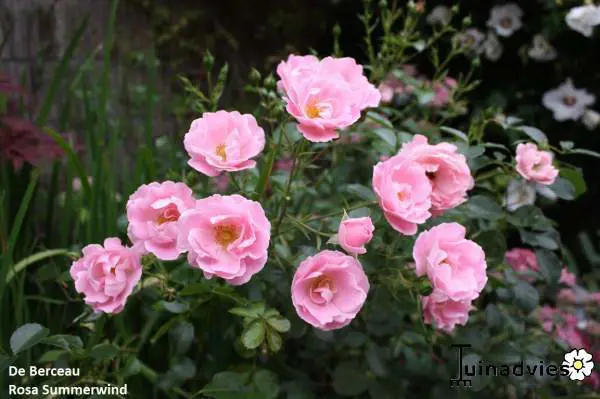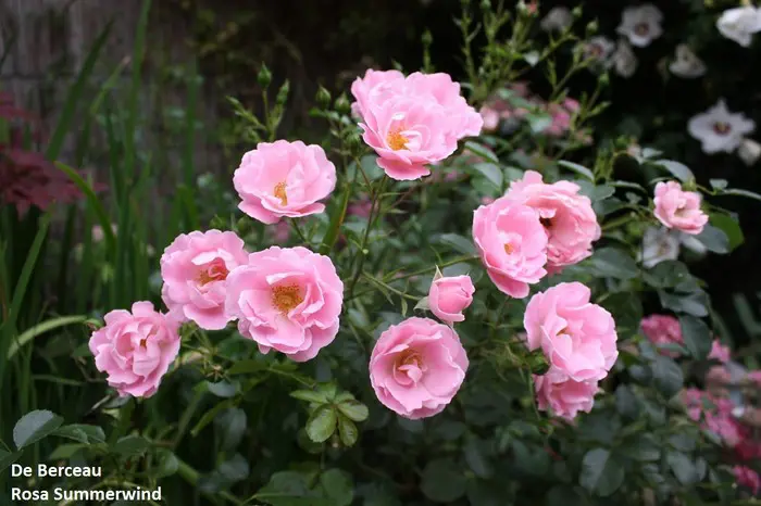 Rosa « Summerwind » fleurit avec des fleurs roses au parfum doux dont les bords des pétales sont ondulés.