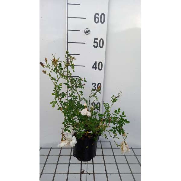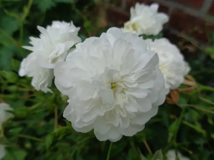 Un couvre-sol rampant s’est dressé avec de petites doubles roses blanches en grappes.